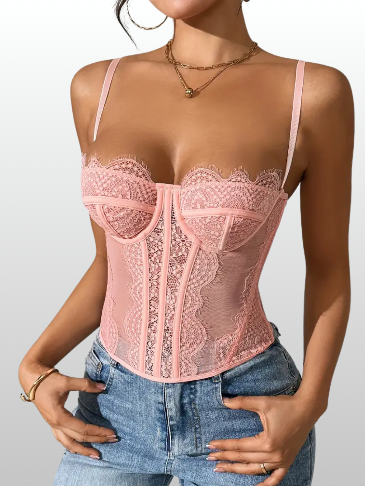 Sexy Spitzenkorsett Top für Frauen | Romantisches Bustier Top mit Push-up | Schickes Mesh Korsett-Top Outfit | Coquette-Ästhetik Spitzentop | Modernes feminines Korsett für Outfits | V-Saum Bustier Top formend | Verstellbares Korsett mit Hakenverschluss | Soft-Romance Spitzen Fashion Top | Trendiges Korsett-Outfit für Date Nights | Spitzenkorsett Top zu Jeans