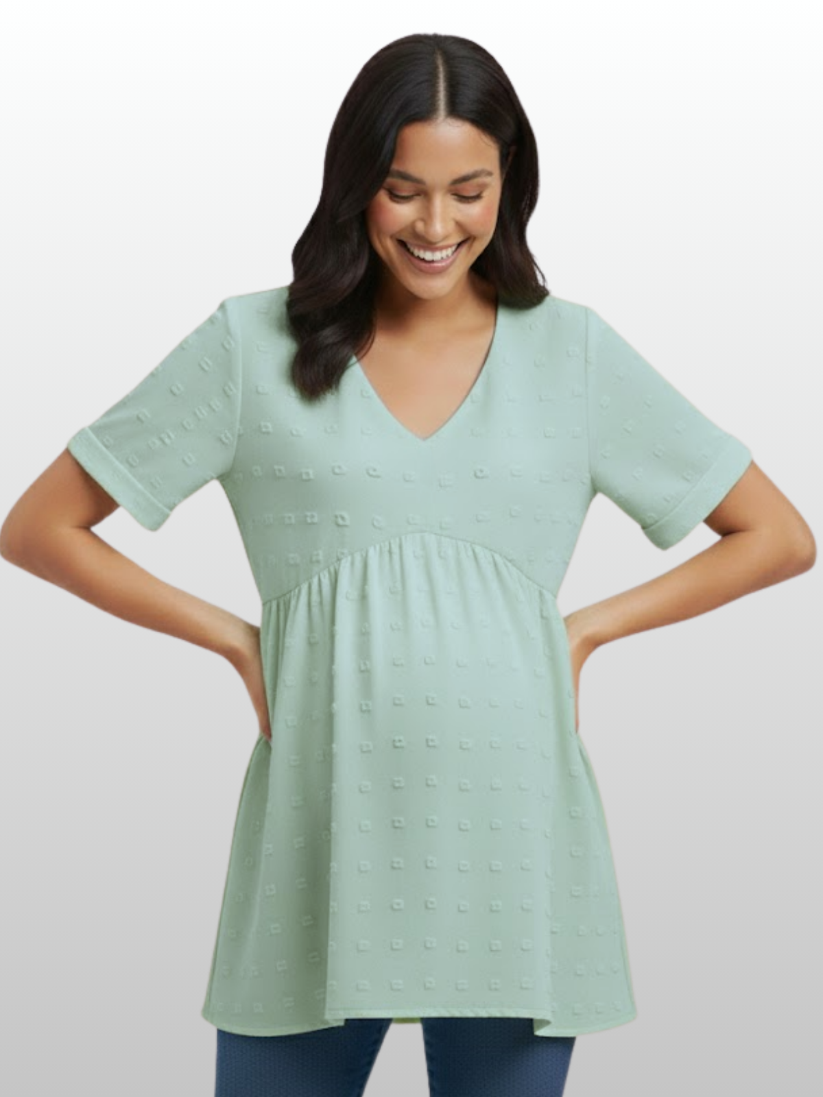 Die mumshape™ Texturierte Blüten-Umstandsbluse ist dein unkomplizierter Favorit für jeden Tag, an dem du hübsch aussehen willst, ohne viel dafür zu tun. Der lockere, fließende Schnitt im Bauchbereich schmeichelt jeder Phase – früher Babybauch, Wochenbett oder einfach nur für gemütliche Tage. Die sanfte Struktur und der luftige Fall lassen sich perfekt mit Jeans, Stoffhosen, Shorts kombinieren – lässig oder elegant, ganz wie du willst.